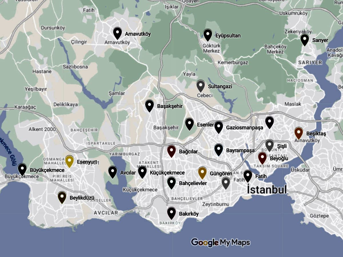 İstanbul’da Adalar, Arnavutköy, Ataşehir, Avcılar, Bağcılar, Bahçelievler, Bakırköy, Başakşehir, Bayrampaşa, Beşiktaş, Beykoz, Beylikdüzü, Beyoğlu, Büyükçekmece, Çatalca, Çekmeköy, Esenler, Esenyurt, Eyüpsultan, Fatih, Gaziosmanpaşa, Güngören, Kadıköy, Kâğıthane, Kartal, Küçükçekmece, Maltepe, Pendik, Sancaktepe, Sarıyer, Şile, Silivri, Şişli, Sultanbeyli, Sultangazi, Tuzla, Ümraniye, Üsküdar, Zeytinburnu ilçelerine ve tüm semtlere hizmetlerimizi ulaştırıyoruz.